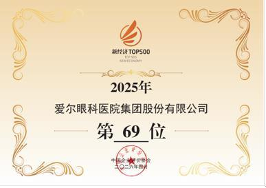 近日,中国企业评价协会联合中指研究院在京正式发布《2025中国新经济企业TOP500发展报告》及系列榜单,并指出“新经济竞争重心正由流量主导转向创新驱动”。爱尔眼科医院集团股份有限公司(以下简称“爱尔眼科”)凭借扎实的创新实践及突出的发展成果,连续五年荣登“中国新经济企业500强”榜单,位列第69位,较去年排名提升4位,彰显出强劲的发展韧性。