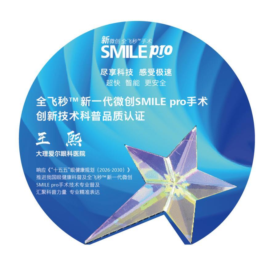 在手术量突破的同时,大理爱尔眼科医院屈光科王熙主任斩获全飞秒™新一代微创SMILE pro手术创新技术科普品质认证,该认证由蔡司官方授予,是对专家手术技术与科普能力的双重权威认可,审核涵盖专业知识、核心工具、科普实战等多个维度,含金量极高。